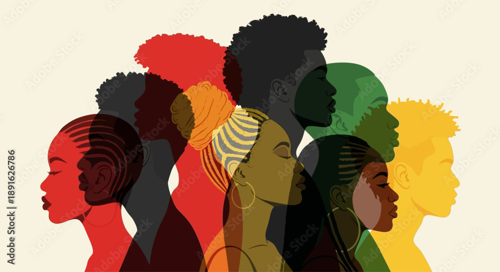 • Diverse Black Community United Vibrant African Faces in Profile Silhouette Symbol of Unity Culture and Strength