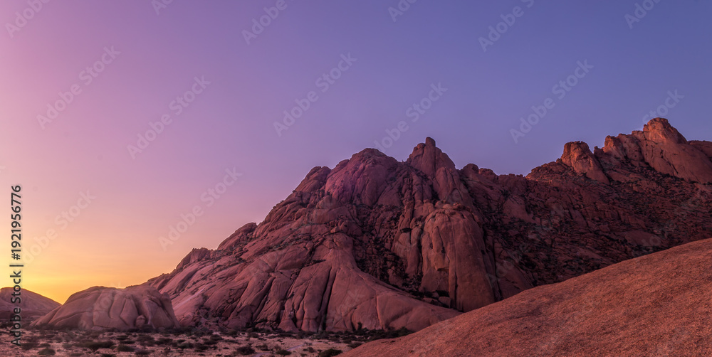 Plakat Afryka - Namibia - Spitzkoppe - Panoramic view of rugged granite mountain range illuminated by soft... #1921956776