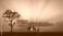 • Amazing sunset and sunrise.Panorama silhouette tree in africa with sunset.Tree silhouetted against a setting sun.Dark tree on open field dramatic sunrise.Safari theme.Giraffes , Lion , Rhino.
