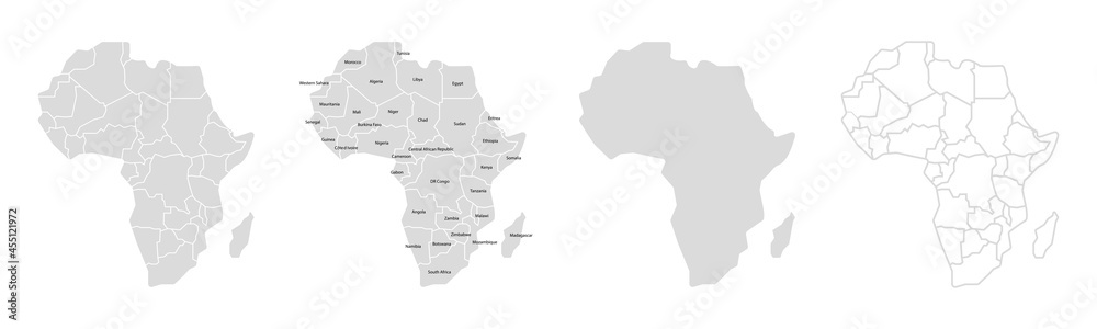 • Africa map vector illustration. Africa silhouette continent. High detailed map in flat and outlined style. Template for your design. Vector elements isolated on white background.