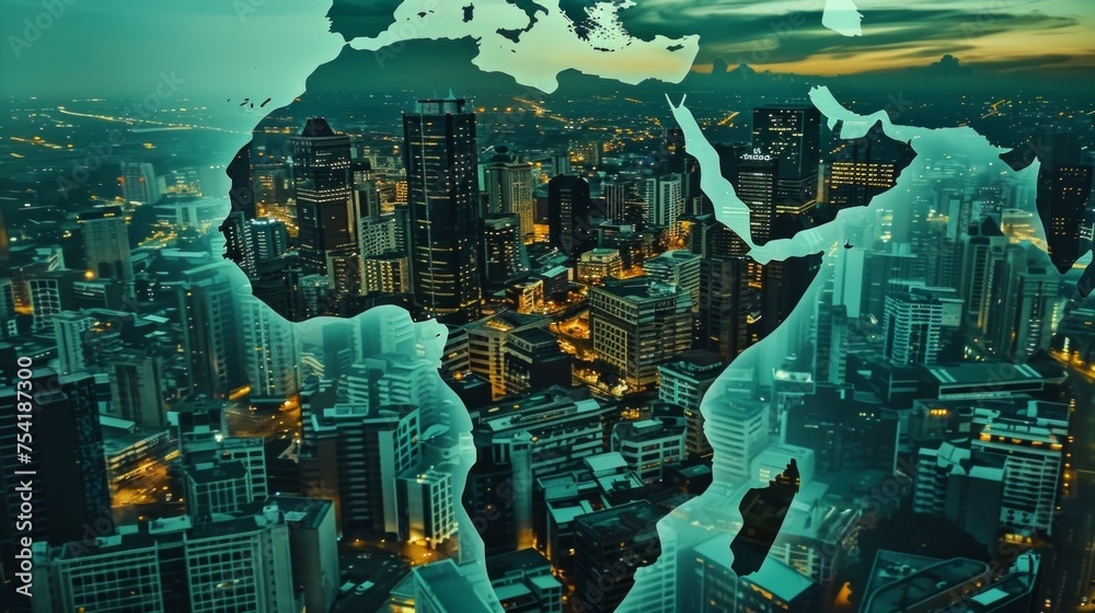 • Africa's growth potential. Double Exposure of Africa Map and Bustling Cityscape
