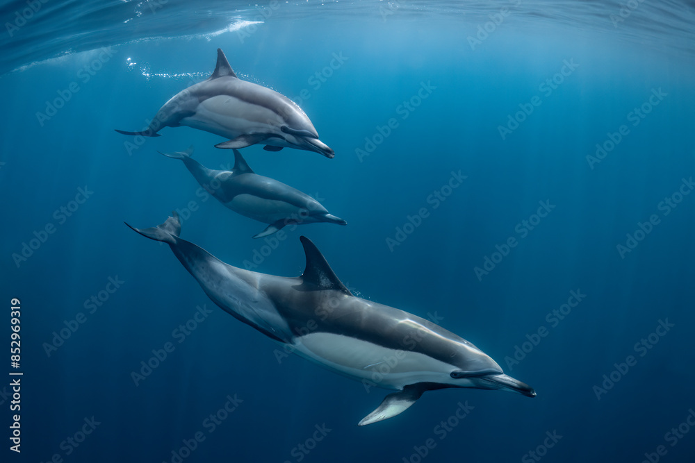 • Pod of common dolphins (Delphinus delphis) swimming in the Atlantic Ocean near the Western Cape coast of South Africa
