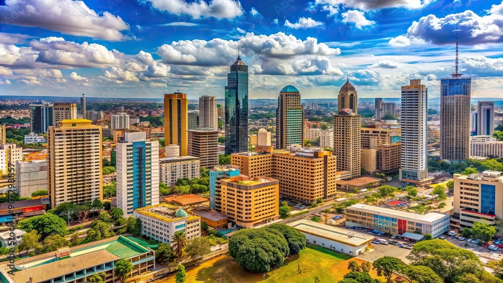 • Busy and vibrant Nairobi cityscape with modern skyscrapers, bustling streets, and colorful buildings, Nairobi