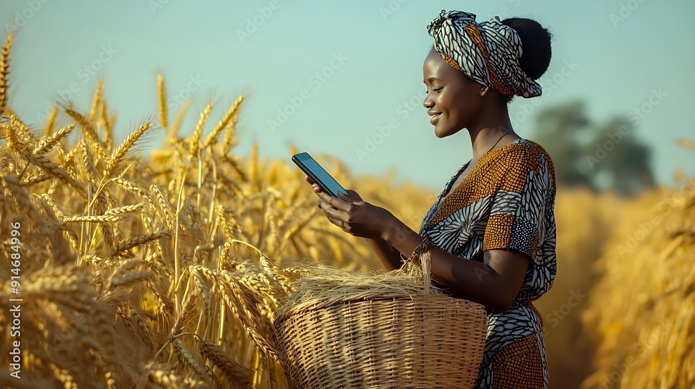 Plakat Afryka - beautiful image of african lady with smart phone and basket in a farmblack woman surfing on... #914684996