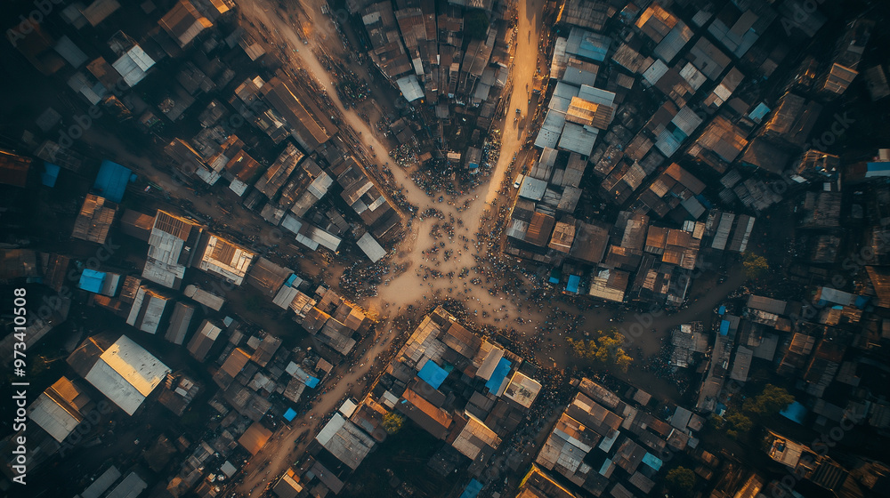 Plakat Afryka - Crowded crossroads in impoverished slum from above #973410508