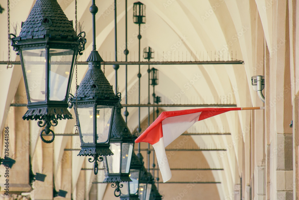 Plakat Architektura - Flaga Polski w krużgankach na Rynku Głównym w Krakowie #1784641586