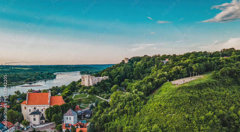 Plakat Architektura - Lśniący w słońcu Kazimierz Dolny latem, uchwycony z perspektywy drona. #593542205