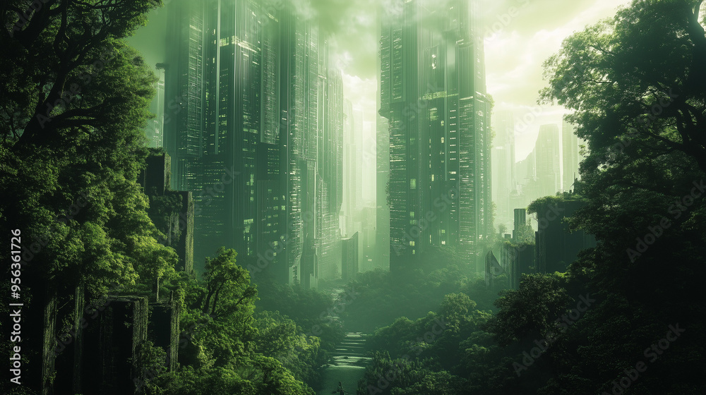 Plakat Architektura - Futurystyczne miasto z wysokimi wieżowcami, otoczone obfitym zielonym lasem. Innowacyjne budynki... #956361726