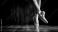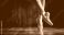 • Elegant ballet dancer legs in pointe shoes. Dancer standing en pointe on dark wooden stage. Artistic black and white classic dance.