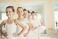 • little caucasian girls in white tutu skirts and pointe shoes dream of becoming great ballerinas, training, practicing classic ballet dance in studio, group of little caucasian graceful girls