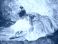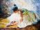• Little girl, ballerina in a lush white ballet tutu, tying pointe shoes in the dance class, under bright daylight. The background is created with expressive strokes. Oil painting on canvas.
