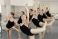 • Young ballerinas training at ballet barre. Group of ballet dancers posing near barre in ballet studio. Difference between gymnastics and ballet.