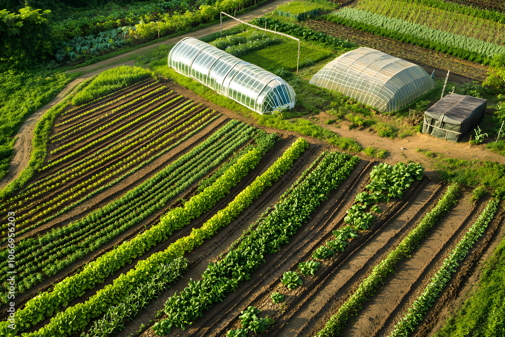 Plakat Farma - Aerial view of an organic farm layout showcasing rows of vibrant vegetables and greenhouses... #1066956203