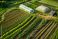 • Aerial view of an organic farm layout showcasing rows of vibrant vegetables and greenhouses surrounded by lush greenery