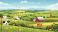• A cartoon style illustration of a farm scene with a red barn, a silo, and a cow.