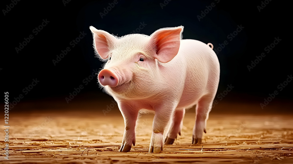 • Pink piglet standing on straw, dark background, farm animal portrait, for agriculture publications