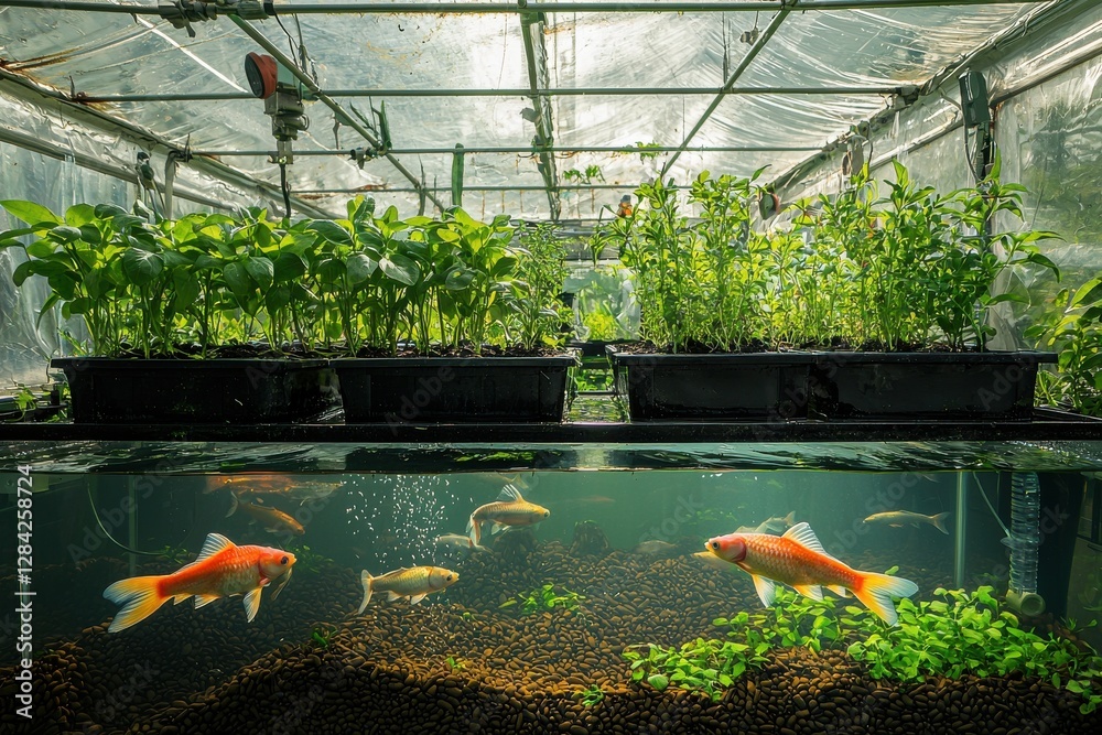 Plakat Farma - A vibrant aquaponics system inside a sunlit greenhouse showcases goldfish swimming below thriving... #1284258724