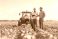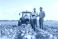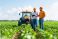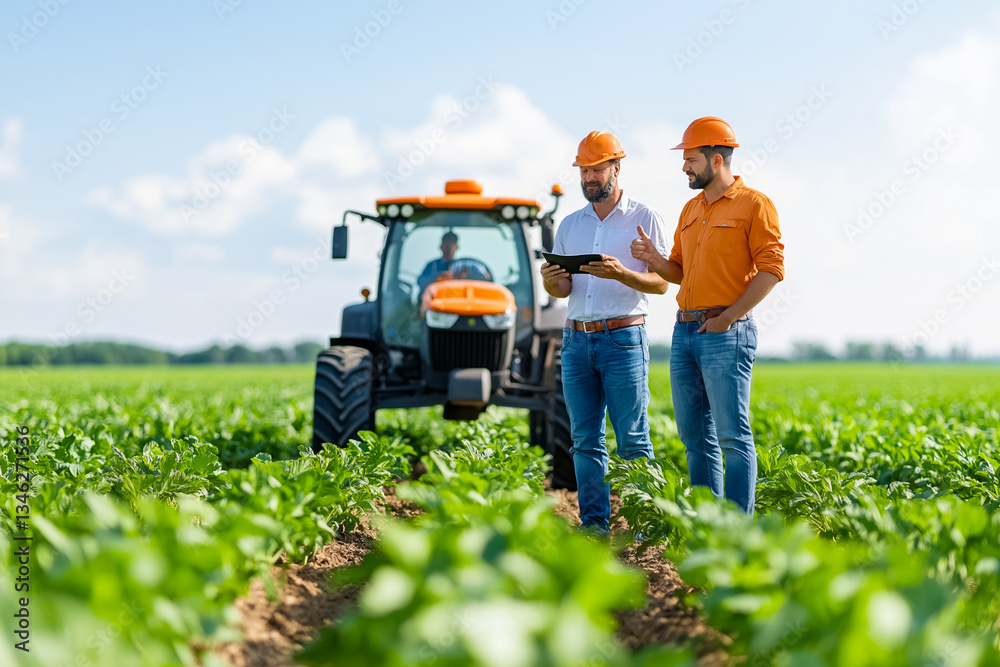 • Two farmers inspect crop growth while discussing agricultural strategies in a vibrant green field. A tractor is situated nearby under a clear blue sky, symbolizing farming progress