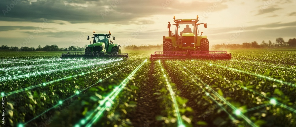 • Engineers designing AI powered autonomous farming tractors, high-tech agricultural field with real-time crop data and AI-driven farming machinery, High-tech style