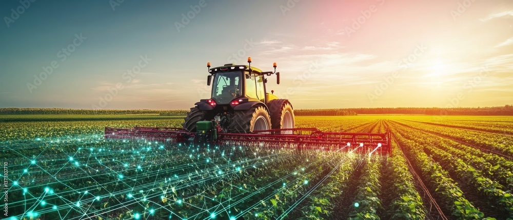 • Engineers designing AI powered autonomous farming tractors, high-tech agricultural field with real-time crop data and AI-driven farming machinery, High-tech style