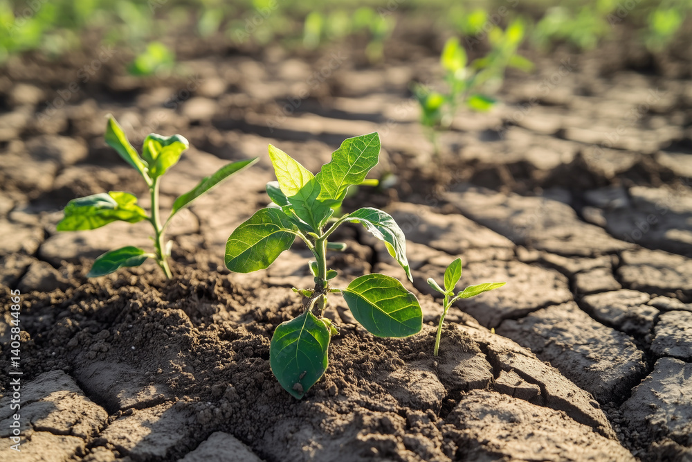 Plakat Farma - Dry Soil with Struggling Garden Plants – Drought Conditions and Water Shortage Concept. Earth day... #1405844865