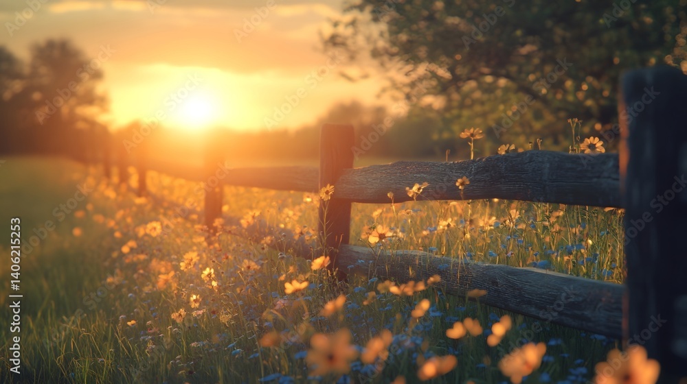 Plakat Farma - The peaceful farm wooden fence under the sunset #1406215253