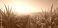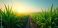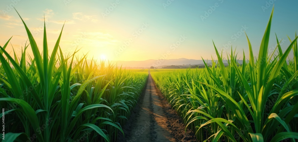 • Sugarcane farm with dirt road under clear sky. Agriculture background in rural setting. Green plants at farmland, golden sunlight at sunset. Farming, harvest, cultivation, landscape, organic.