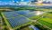 • Aerial view of solar energy farm for sustainable renewable power and eco development