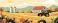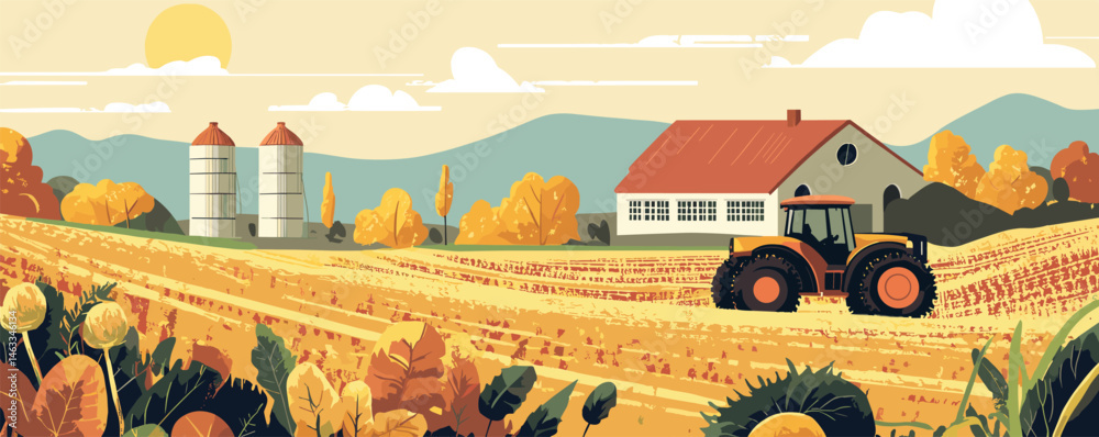 • Tranquil autumn farm landscape with tractor, silos, and harvested fields under a sunny sky.