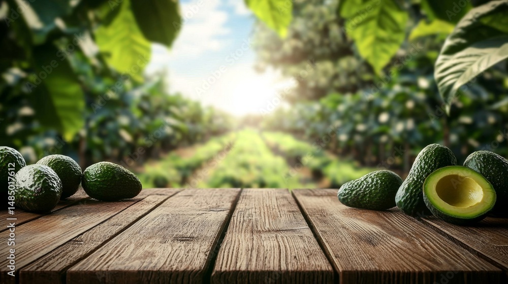 Plakat Farma - The rustic charm of a wooden table provides a beautiful contrast to an avocado farm backdrop. #1485017612