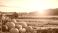 • Autumn Harvest Abundance: A bountiful display of pumpkins of varying sizes and colors sits on a rustic wooden surface against the backdrop of a picturesque autumn sunset over a farm field.