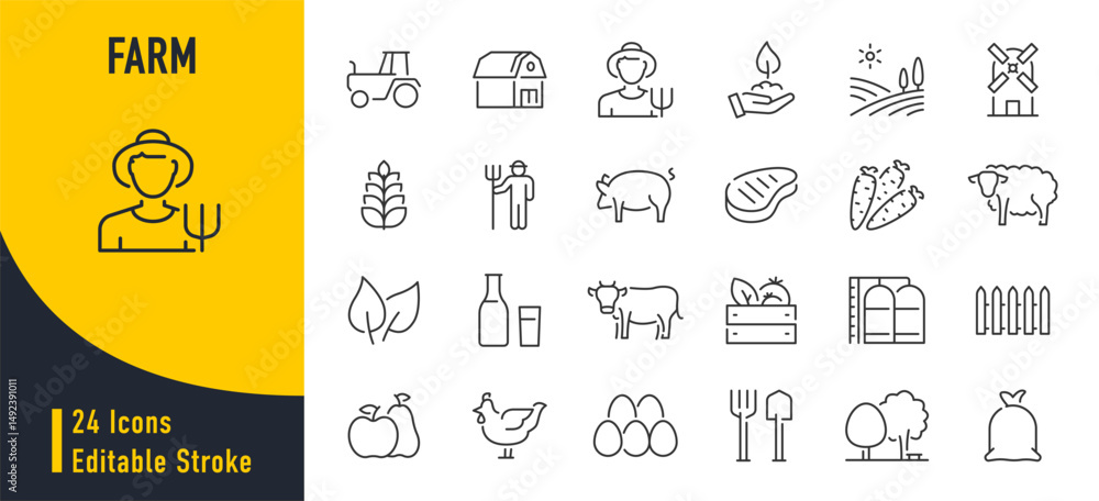 Plakat Farma - Farming web icons in line style. Agriculture, planting, fertilizer, vegetables, tractor, farmers,... #1492391011