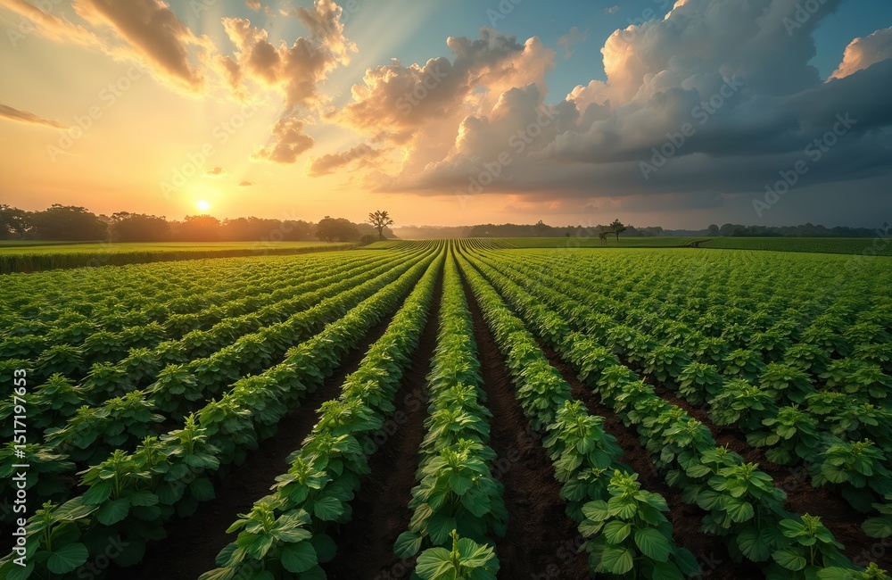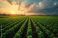 • Soybean plantation at sunset with intense clouds. Rural landscape showcases rows of cultivated crops on farm field. Agriculture scenery at dusk. Harvest season, agricultural land growth food.
