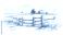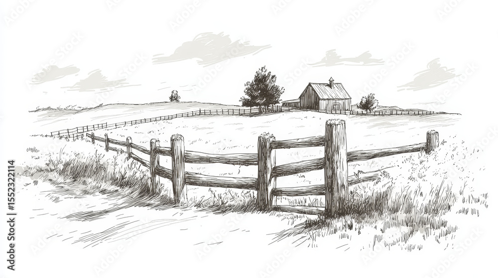 • Hand-drawn farm landscape with wooden fence, vintage rustic style, sketch on white background.