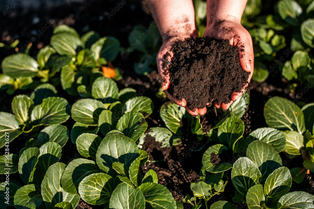 Plakat Farma - women in agriculture looking at a soil sample. girl on a farm looking at plant roots, female... #1562843627