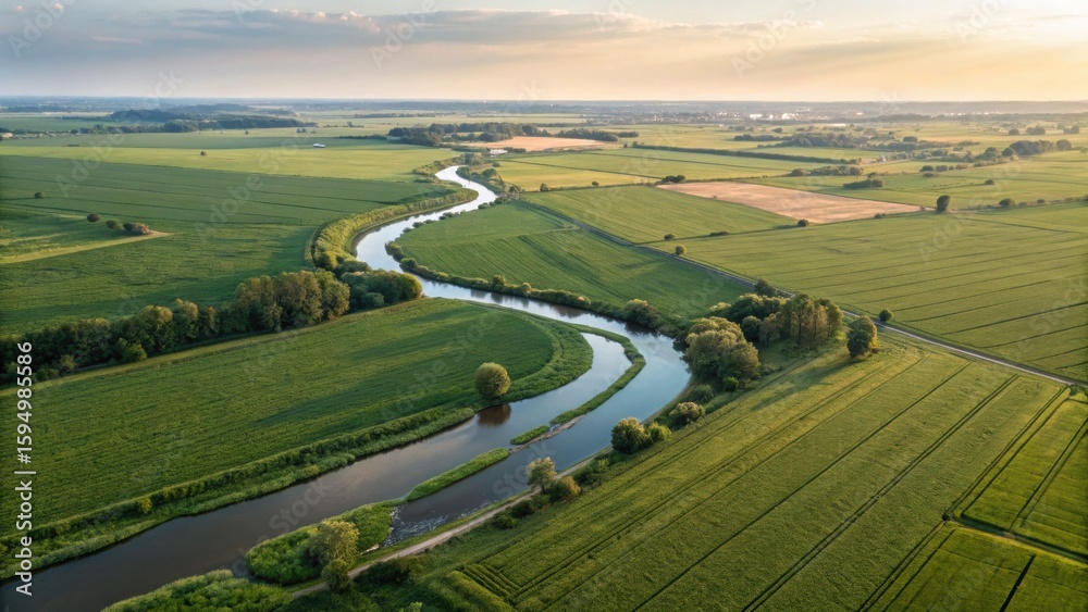 Plakat Farma - Aerial view of winding river through green fields at sunset, showcasing rural landscape #1594985586
