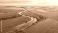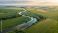 • Aerial view of winding river through green fields at sunset, showcasing rural landscape