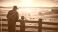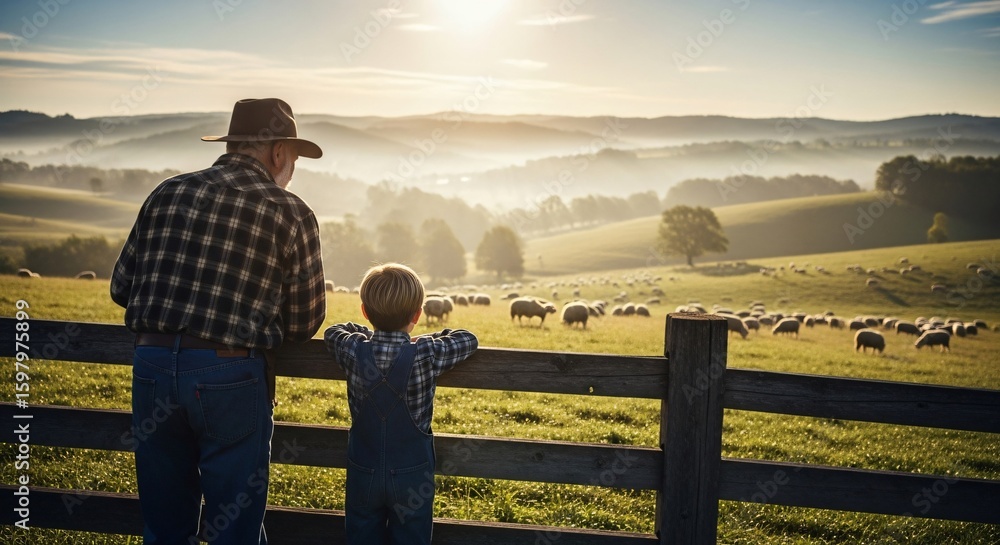 • Heartwarming generational scene on a farm. Grandfather and grandson bonding over sheep grazing at sunrise. Perfect for family, heritage, agriculture, or Father's Day ads.