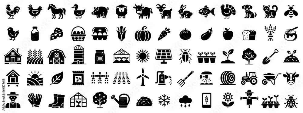 • Agricultural vector icons including farm animals, crops, tools, buildings, and equipment for farming, food production, environment, and rural life themes