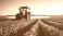 • Tractor spraying crops on a sunny farm field Agriculture and technology in farming