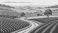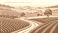 • Scenic countryside landscape vector illustration with rolling hills and farm fields for graphic design use