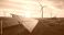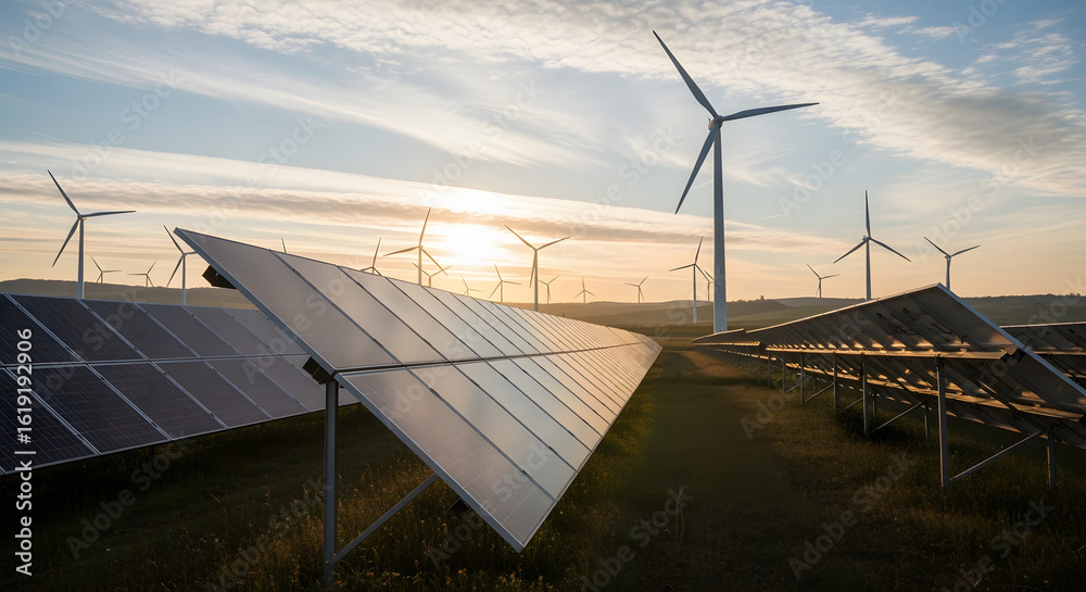 • A field of solar panels and a wind farm with turbines generating clean, renewable electricity at sunrise.