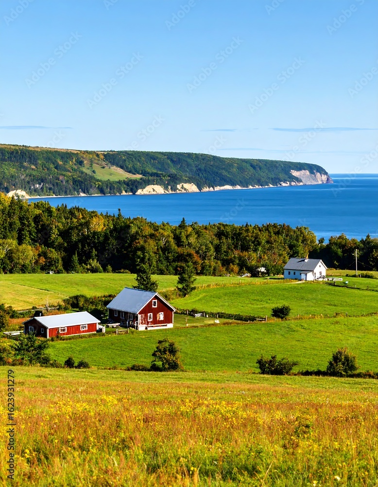 Plakat Farma - Coastal farm landscape with bright sun #1623931279