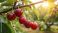 Plakat Farma - Ripe Cherry hanging on tree with water drop in garden, Cherry tree in natural warm sunlight view #1624180748