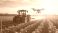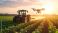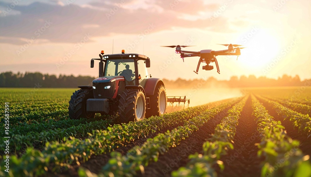 • This image showcases a harmonious blend of modern farming and futuristic technology, with a state-of-the-art tractor plowing a vast expanse of farmland as the sun sets.  Above it, a,tractor in field