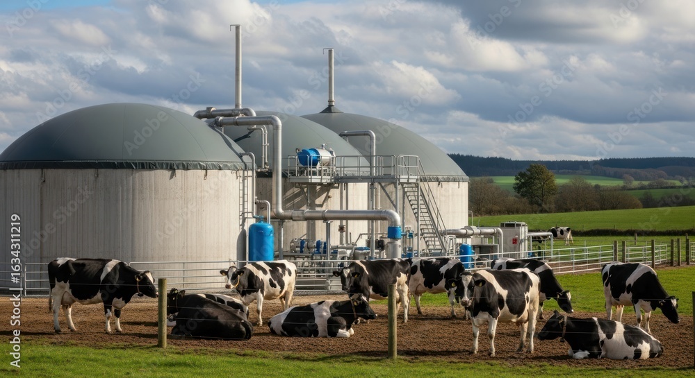 • Sustainable Farming: Holstein Cows by a Rural Biogas Plant