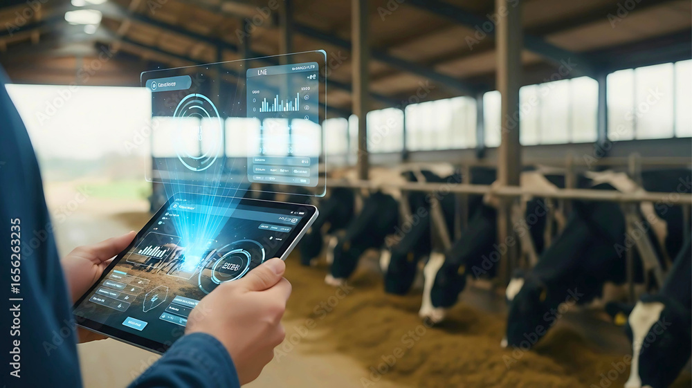 • Farmer utilizing a futuristic tablet with a holographic interface for data analysis in a smart dairy farm