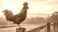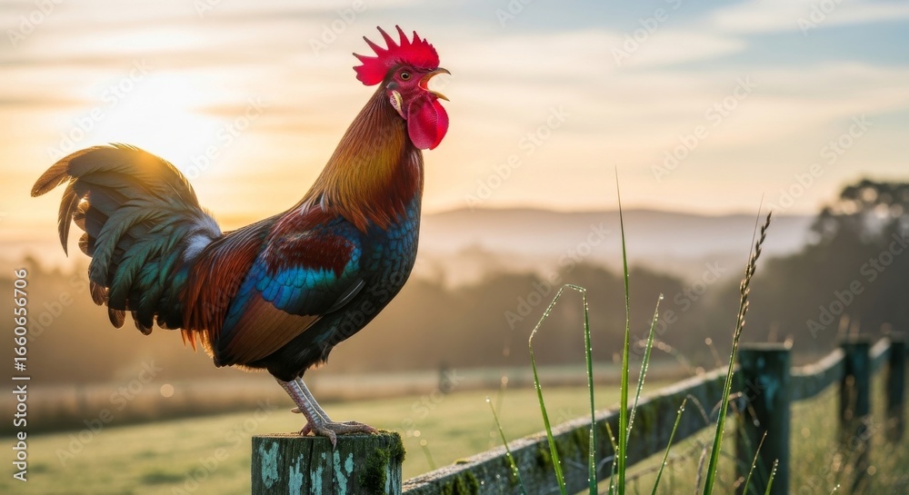 Plakat Farma - Rooster crowing at sunrise on a farm fence. #1660656706