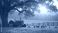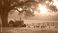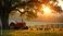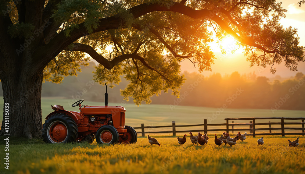 • Tranquil farm landscape at sunset with vintage tractor, chickens grazing in golden hour light. Rustic countryside scene evokes peaceful serenity. Mature tree provides shade over grassy meadow with
