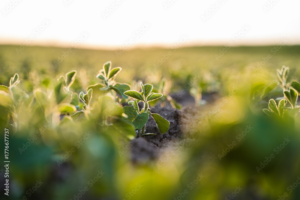Plakat Farma - Young soybean plant glowing in backlight on cultivated farmland at early growth stage #1776677737